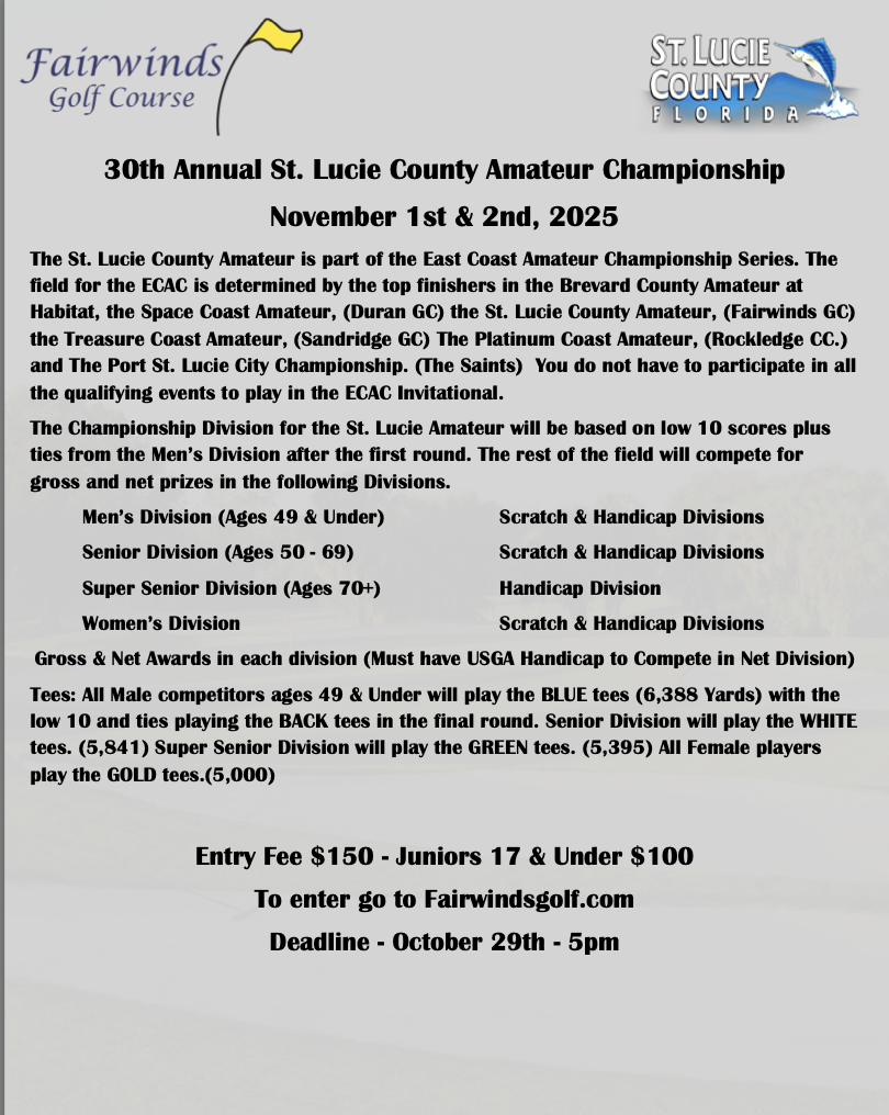 The St. Lucie County Amateur is part of the East Coast Amateur Championship Series. The field for the ECAC is determined by the top finishers in the Brevard County Amateur at Habitat, the Space Coast Amateur, (Duran GC) the St. Lucie County Amateur, (Fairwinds GC) the Treasure Coast Amateur, (Sandridge GC) The Platinum Coast Amateur, (Rockledge CC.) and The Port St. Lucie City Championship. (The Saints) You do not have to participate in all the qualifying events to play in the ECAC Invitational.